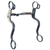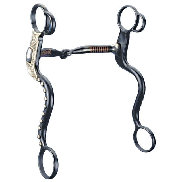 A beautiful gun metal blue snaffle with round cheeks with harness dot overlays and nickel silver overlay. 5 1/8" snaffle mouth inlaid with copper and "long barrel" no pinch mouth. It has low to moderate leverage and can be used for all kinds of riding.