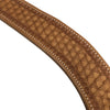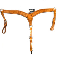 Beautiful and heavy-duty All-around Breast Collar with snowflake stamping. The 2" chest straps with tie-down strap that tapers down from 2" to 1". Available in light or dark oil colors.