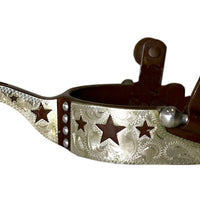These youth sized spurs are classic and stylish. They are built to fit the foot of the younger cowboys and cowgirls. They are a lovely antique brown color with silver engravings on the band. The rowel is gentle and excellent for riders new to spurs in order to connect with the horse properly.