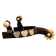 A black steel kids spur with 1/2" band with nickel silver heart trim. Brass buttons and rowels.