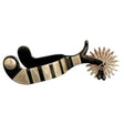 A beautiful black steel spur that has it's heart in the west! It has black jingle bobs, 2 1/4" shank with overlaid chap guard and 20 point 2 1/8" stainless steel rowels. Hand engraved nickel silver overlay on band.