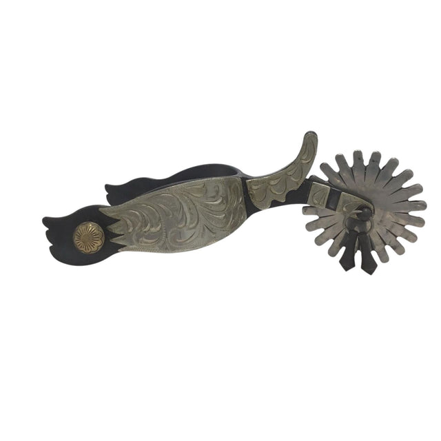 A black steel spur with hand engraved nickel silver overlay. 1 1/4" shaped band, 2 1/2"shank with chap guard, 20 point, 2 1/4" rowel and black steel jingle bobs.