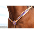 Un hermoso collar de cuentas con el estilo Colorado. Correa de pecho de 5 cm con forma de 19 mm de ancho, herrajes de acero inoxidable y una concha central con cuentas. Cabezada a juego disponible.