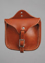 Cuero rojizo grueso. Se fija a la silla de montar. 14 cm de ancho x 10 cm de largo x 3,8 cm de grosor.