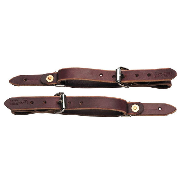 Diseñadas para tensarlas, las correas de las espuelas están hechas de látigo grueso de grano superior, especialmente para jinetes de toros y caballos salvajes. Hebilla gruesa en un extremo y hebilla en D en el otro. Pestaña gruesa.