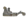 Espuela juvenil de acero inoxidable con banda de 3/4" con 3 cruces de latón y revestimiento de alpaca. Caña de 1 1/2", espuelas de doce puntas de 3/4" y botones oscilantes.