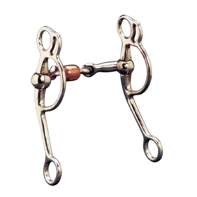 Casilleros de acero inoxidable de 6 3/4" y embocadura de 3 piezas de 5" con rodillo deslizante de cobre. Este bocado ayuda a dar la señal al caballo ligeramente por delante de la señal completa y a anticipar las órdenes. Apalancamiento bajo a moderado.