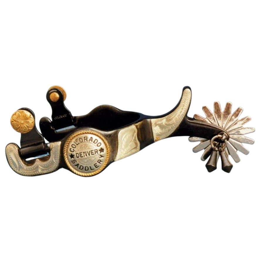Esta espuela refleja la calidad que se corresponde con el logotipo de Colorado Saddlery. De acero azul con revestimiento grabado, conchas con borde de cuerda de latón, botones de latón y espuelas de acero inoxidable, ¡esta espuela es un auténtico clásico! El cascabel negro se balancea para ofrecer un sonido similar al de una campana.