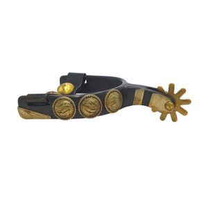 Espuela infantil de acero negro con banda de 1,6 cm y revestimiento de alpaca grabada. Tiene un vástago rebajado de 3,1 cm y una rueda de nueve puntas de 2,5 cm.