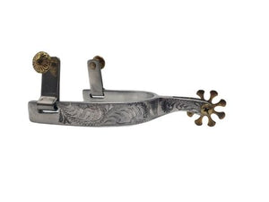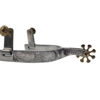 Espuela de aluminio grabada a mano con botones oscilantes. Banda de 16 mm, caña de 38 mm y rueda de ocho puntas con clavos tipo herradura de 38 mm. Es una espuela versátil que se adapta bien a la bota y se comunica eficazmente con el caballo.