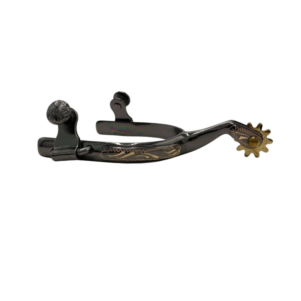 Espuela azul medianoche, estilo cuerda, con cuello de cisne de 4,35 cm y revestimiento de latón grabado a mano. Espuelas de latón de 2,25 cm y 10 puntas, y botones de latón oscilantes. Ligera y cómoda.