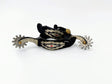 Espuela de acero negro bien equilibrada con un revestimiento especial de alpaca bicolor estilo suroeste, banda de 3,8 cm, caña de cuello de cisne de 5 cm y rueda de doce puntas de 3,8 cm. Botones oscilantes con revestimiento de alpaca.