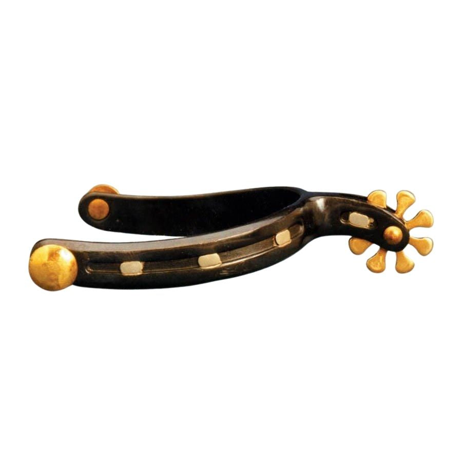 Estas espuelas se ajustan perfectamente a la bota y se comunican bien con el caballo. Una espuela de herradura de acero negro con banda de 3,18 cm (1 1/4"), tres cabezas de clavo de latón, botones fijos de latón y espuelas de latón de 8 puntas.