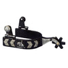 Espuela negra, bien elaborada y equilibrada, con anilla de 2,5 cm, caña de 4,35 cm y espuelas romas de 2,5 cm y 6 puntas. Revestimiento de alpaca grabado a mano en la anilla con reiner.