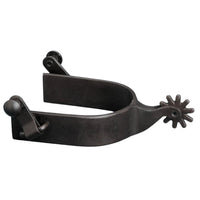 There is nothing fancy about these spurs, just a clean heavy duty spur that will hold up to years of use. Antique brown finish with a 1" heavy band, 1 1/2" shank and a 1" 10 point rowel. Forward lean buttons to fit onto packer boots or cowboy boots.