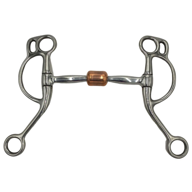 A stainless 4-Rein bit with a copper roller. Designed for training or for everyday riding. The copper roller helps calm a horse and will help keep the mouth moist. It has low to moderate leverage and can be used as an everyday bit for many horses.6 3/4" stainless steel cheeks, 5" snaffle mouth with copper roller.