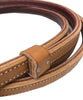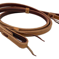 The Double and Stitched Akers Adjustable Rein can be ridden at 6-8 Feet. 3/4" Width The Leather slides easily to set the reins at the rider's desired length. These reins are double and stitched for additional strength and malleability. These are made from the highest quality and an excellent Adjustable Rein.