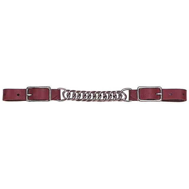 This curb strap works well without being severe. High quality leather straps with a nickel plate flat chain.