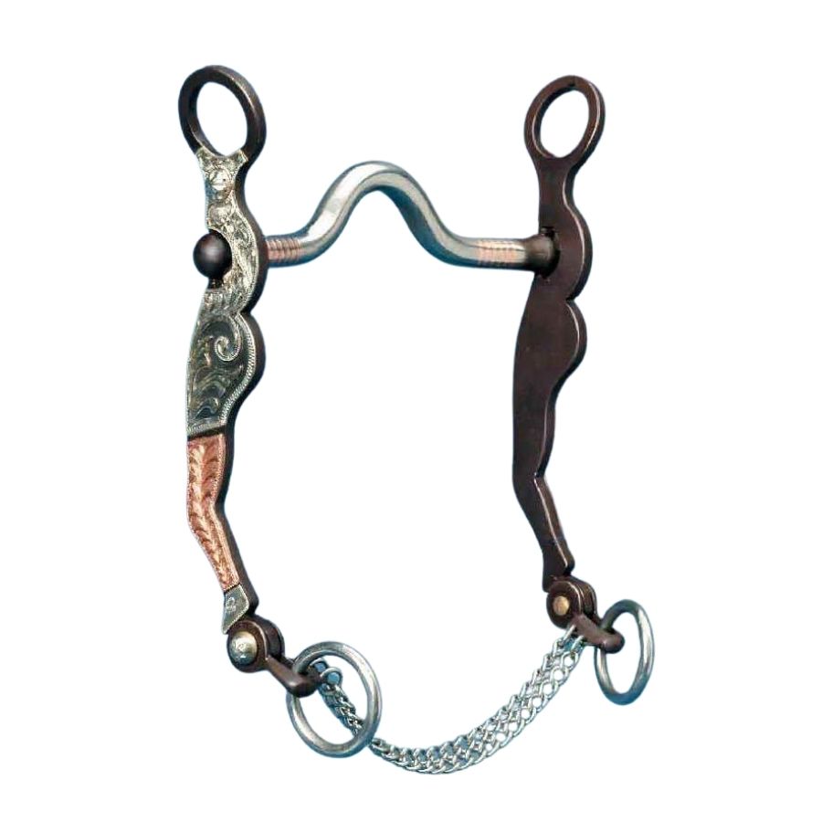 A fantastic old style bit! The 5" curb mouth with inlaid copper and ball mouthpiece ends for smooth non-pinch action. 7" cheeks with engraved nickel silver & copper lady leg.