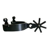 A black steel Mexican style spur. 1" wide band with 2 1/4" seven point black rowels. The rowels can be locked for more direct contact.