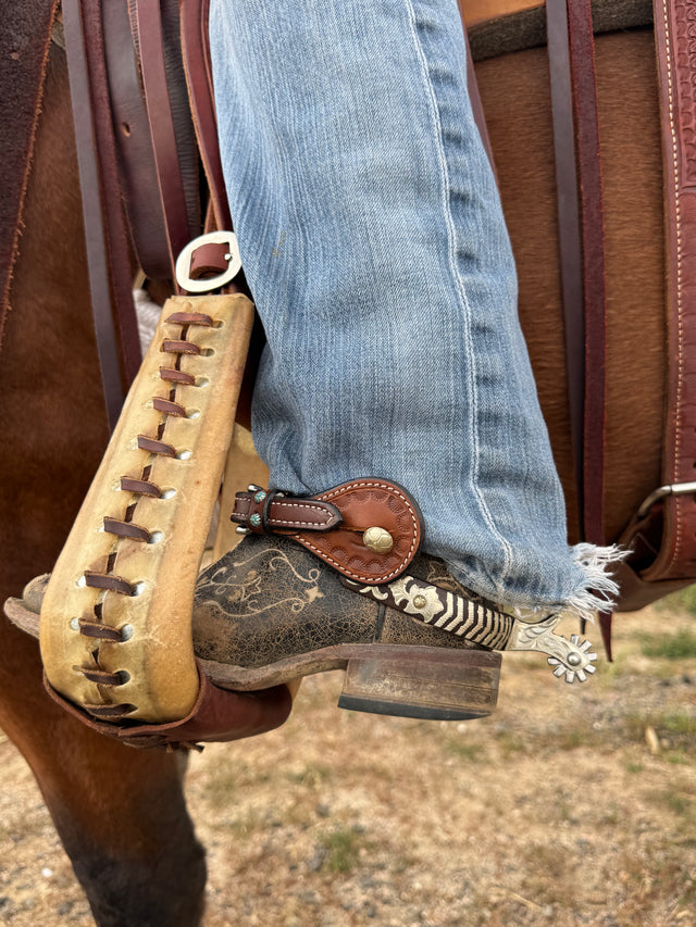 Elegant, balanced, and designed to fit comfortably on your boot, the Sunflower Spurs combine classic style with practical performance. Featuring a nickel silver overlay on antique brown trim, these spurs offer both beauty and function in the saddle.