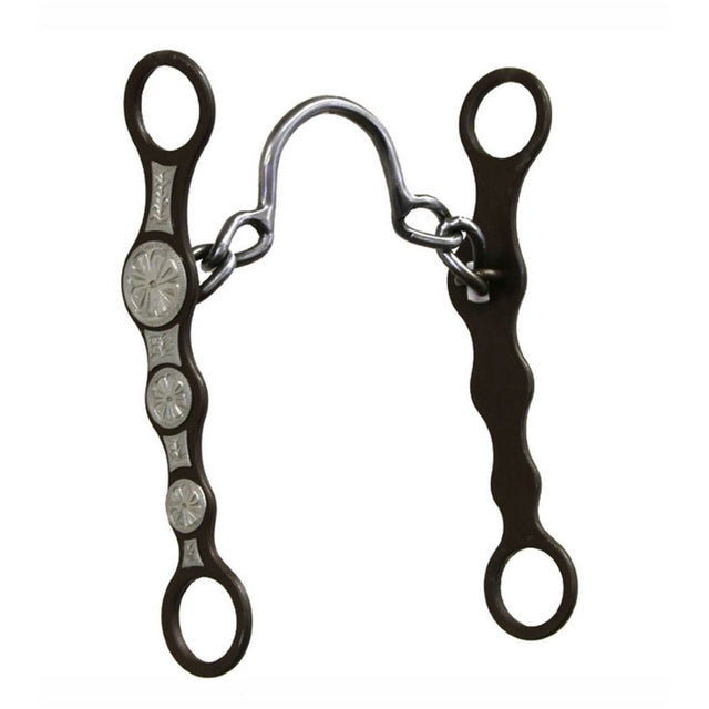 This bit is designed as a control bit for both horses and mules. Cheeks swivel to allow for 2 hand turning. 5" chain mouth with curb center for tongue clearance. 7 1/2" cheek with nickel silver overlay. This is a moderate to aggressive leverage bit.